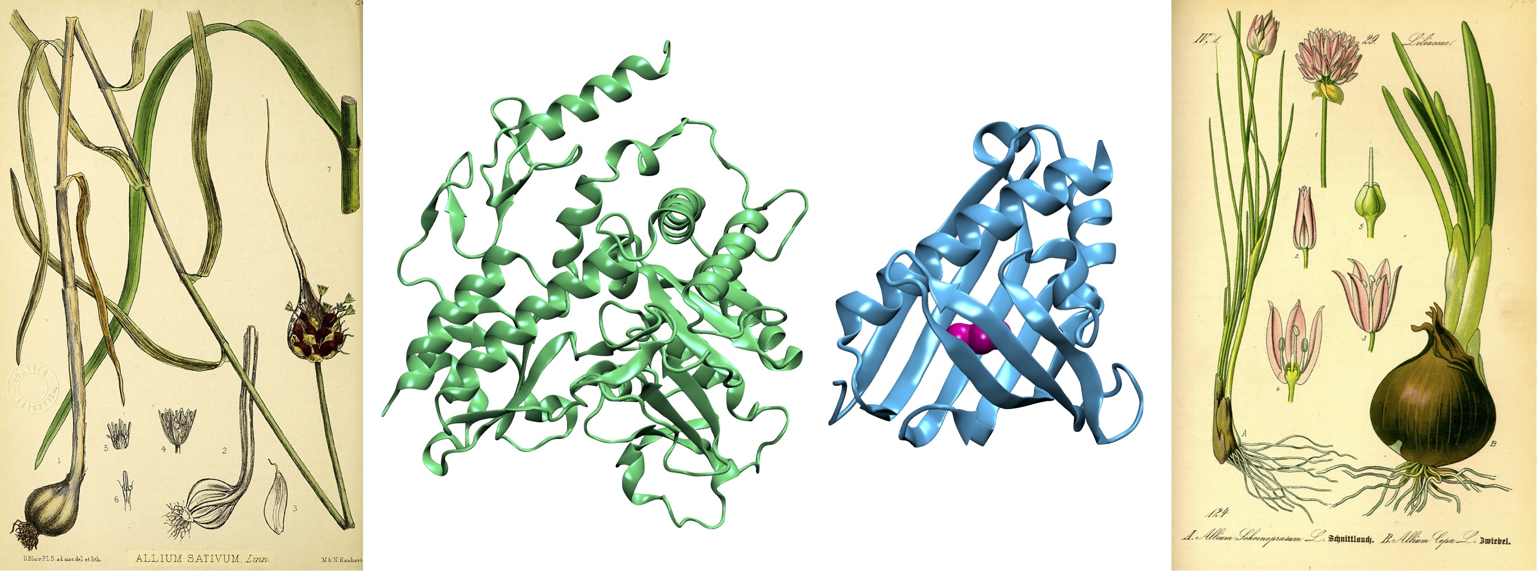 Les brassicacées ne sont pas la seule famille de plantes qui ont recours à des composées soufrés pour se protéger des insectes ravageurs ou d’organismes pathogènes (bactéries ou champignons). Cette stratégie a également été adoptée par le groupe des liliacées, dans lequel on rencontre l’ail et l’oignon. Lorsque la parois des cellules végétales est endommagée par le prédateur, l’enzyme alliinase va réagir avec l’alliine, une petite molécule soufrée, ce qui aboutit à la formation d’allicine, la molécule qui donne son goût si particulier à l’ail et qui possède des propriétés anti-bactériennes et anti-fongiques. Dans le cas de l’oignon, une seconde protéine entre en jeu, la Lachrymatory Factor Synthase (soit LFS), qui va réagir à son tour avec l’allicine pour former un composé volatil, le lachrymatory factor, qui est un irritant pour nos muqueuse et le responsable des larmes versées par des générations de cuisinier·e·s amateur·rice·s d’oignon.