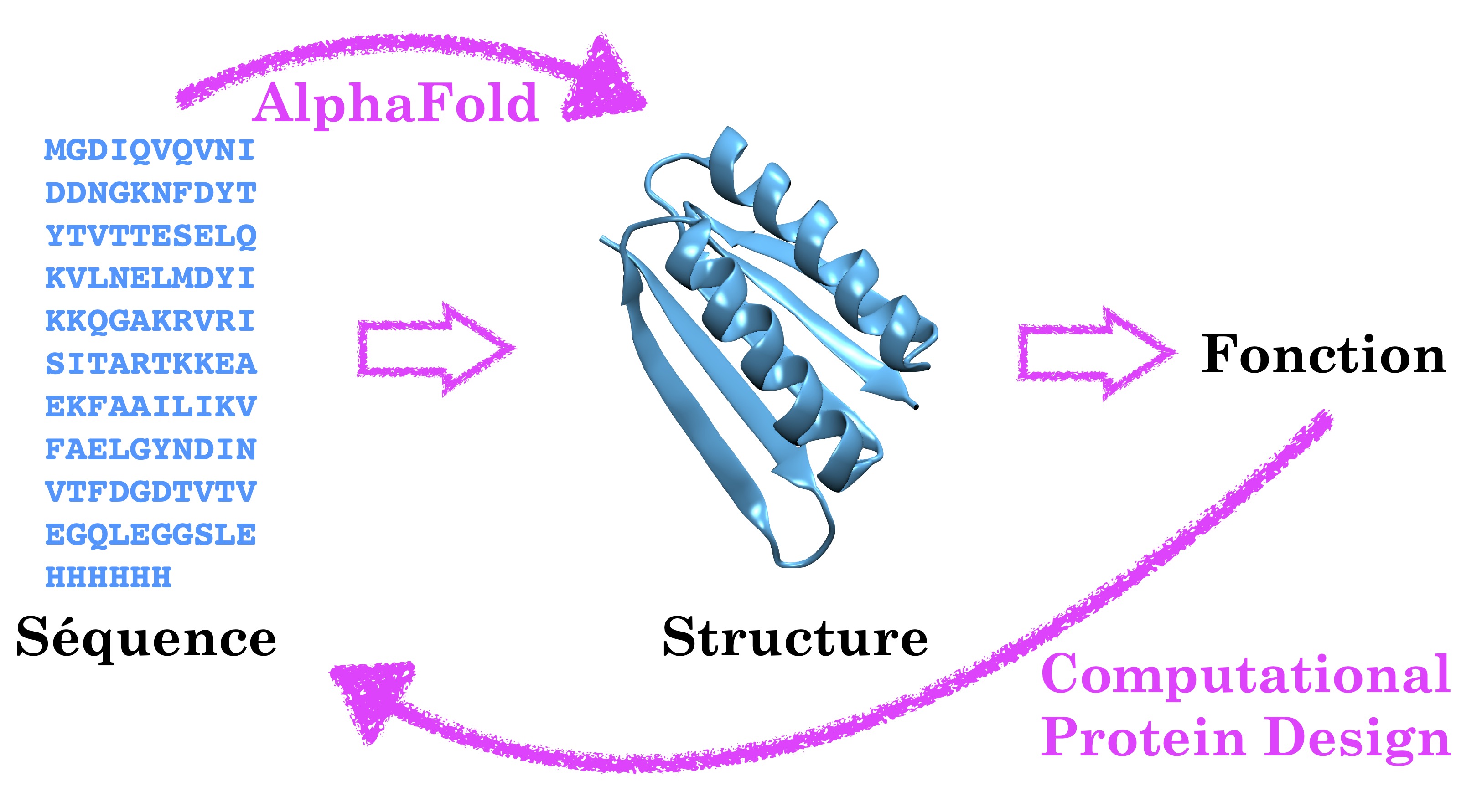 Quand ce problème est abordé via des outils de modélisation informatique, on parle de Computational Protein Design (CPD). Et ce sont les réussites de l’équipe Baker dans le domaine qui lui ont valu une moitié de Nobel le mois dernier. Leur premier succès en la matière date de 2003, avec la conception de TOP7, une petite protéine artificielle (dite aussi de novo) d’une centaine de résidus, dont le repliement ne resemble à aucune autre. Cette approche marque une rupture avec les recherches développées jusque là, du côté de l’évolution dirigée ou de l’ingénierie protéique, où l’on partait d’une protéine existante dont on modifiait ou modulait l’activité avec des changements ciblés dans la séquence. Dans le CPD, on repart de zéro et l’on reconstruit une séquence complète. Comme le dit Baker lui même Si vous voulez bâtir un avion, vous n’allez pas pas modifier un oiseau. Et il lui a d’abord fallu comprendre les grands principes fondamentaux qui régissent le repliement des protéines avant de pouvoir générer de nouvelles séquence inédites.
